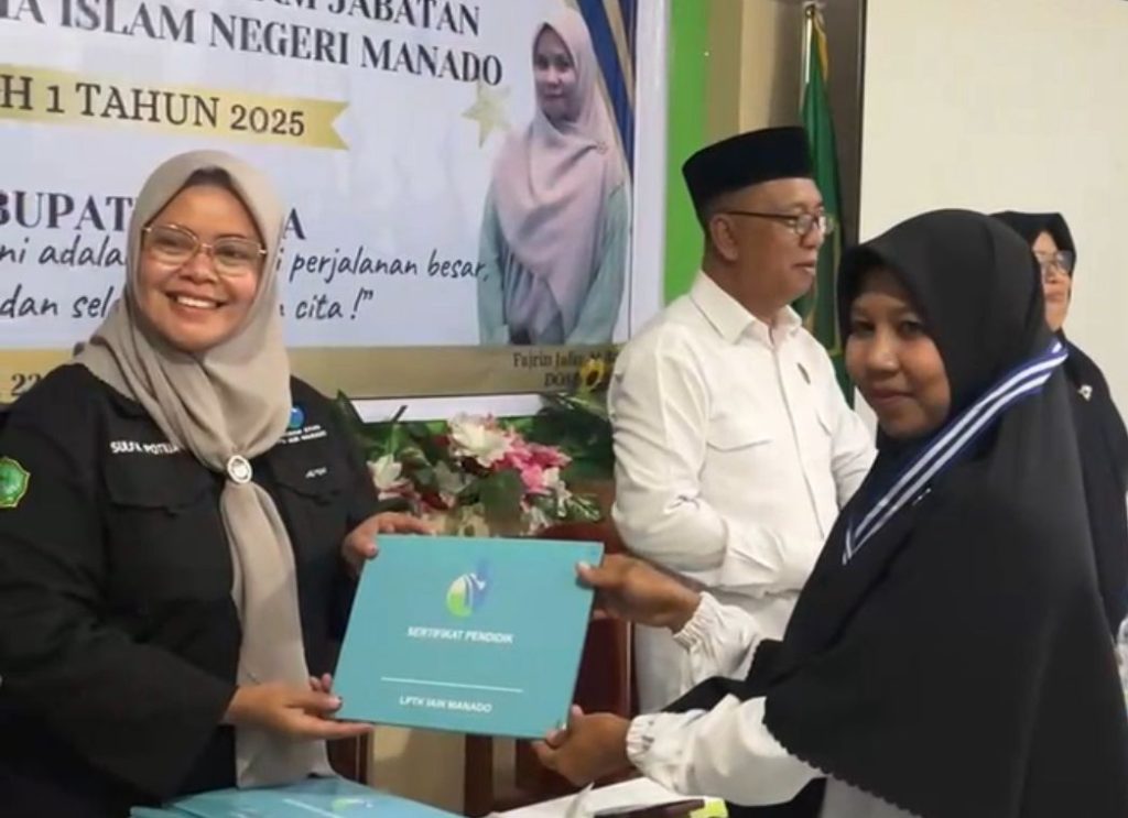 Dalam sambutannya, Kaprodi PPG IAIN Manado, Dr. Sulfa Potiua, M.Pd.I, menyampaikan rasa syukur dan apresiasi atas sambutan hangat dari para penerima sertifikat dan mitra di daerah.