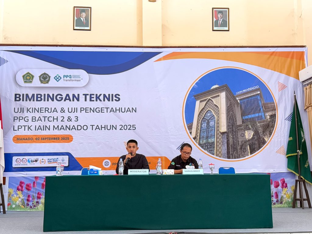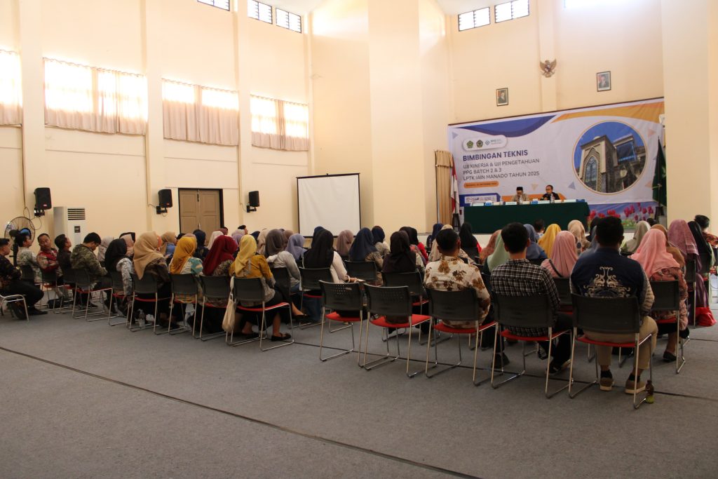 Program Profesi Guru (PPG) LPTK IAIN Manado kembali melaksanakan Bimbingan Teknis (Bimtek) Uji Kinerja (UKIN) dan Uji Pengetahuan (UP) Batch 2 dan 3 Tahun 2025. Kegiatan yang berlangsung di Aula IAIN Manado ini diikuti oleh para peserta PPG yang akan menghadapi tahapan penting dalam proses profesi keguruan.