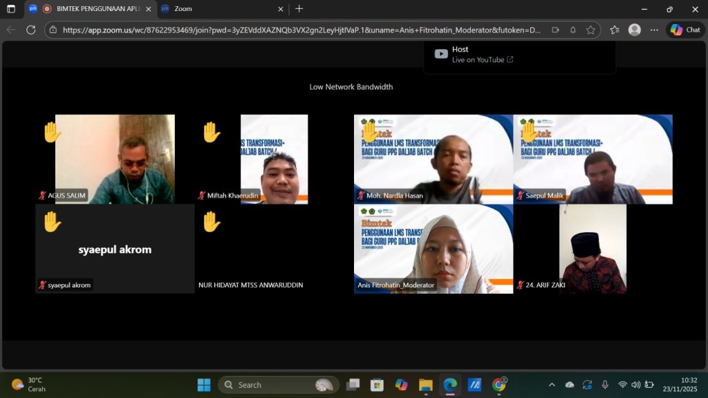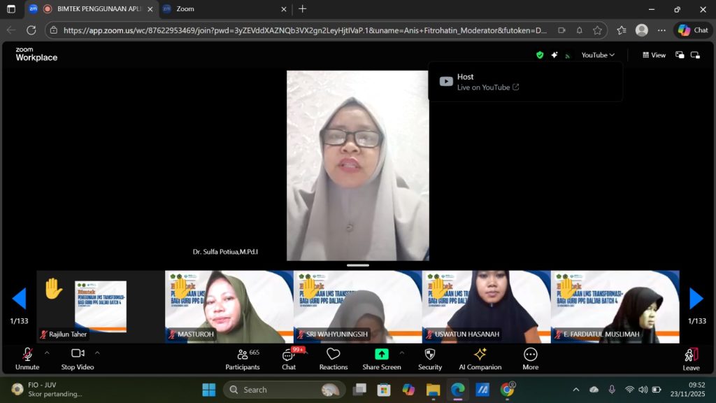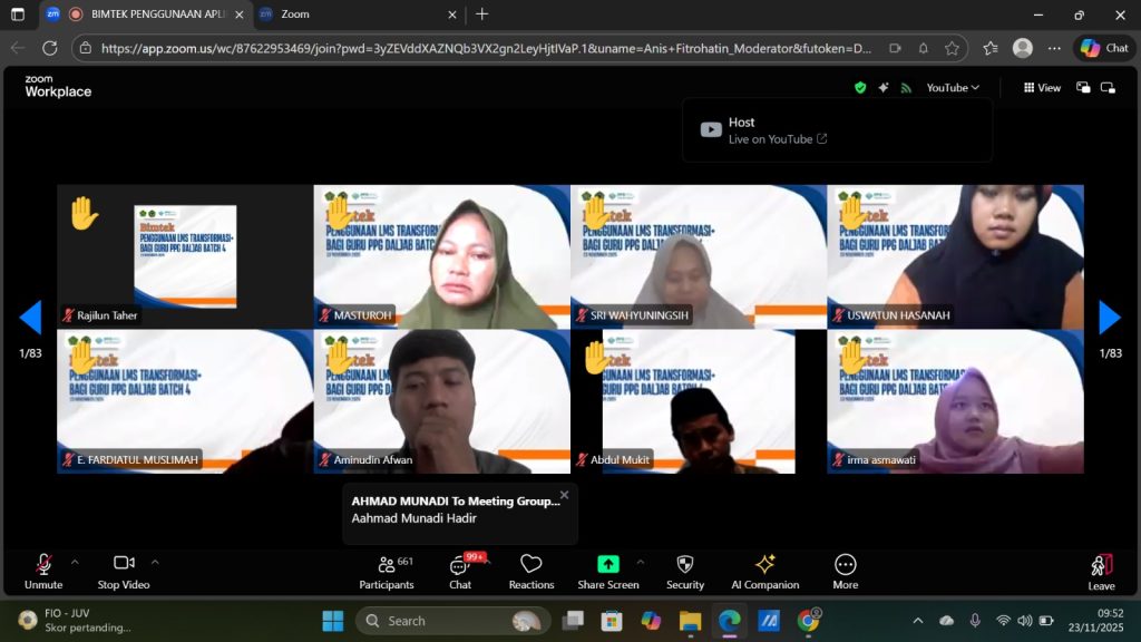 Lembaga Pendidikan Tenaga Kependidikan (LPTK) IAIN Manado menyelenggarakan Bimbingan Teknis (Bimtek) Penggunaan LMS Transformasi Plus bagi Guru PPG Dalam Jabatan (Daljab) Batch 4 Tahun 2025. Kegiatan ini berlangsung secara daring melalui Zoom Meeting pada 23 November 2025, sebagai upaya mendukung kelancaran proses pembelajaran dan penilaian selama program PPG.