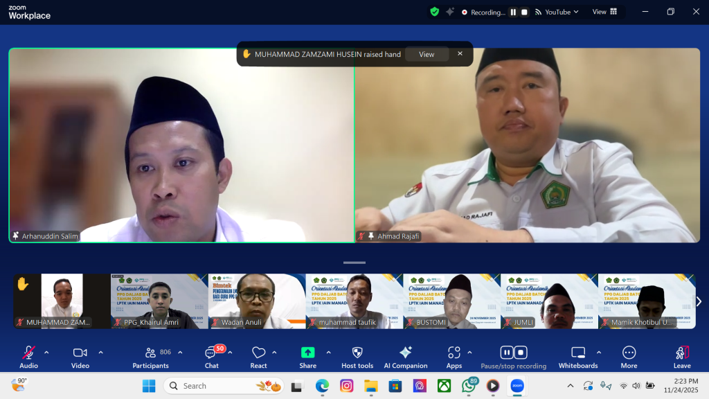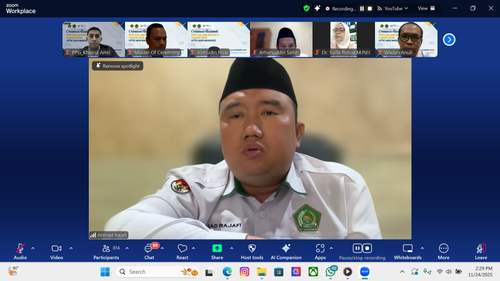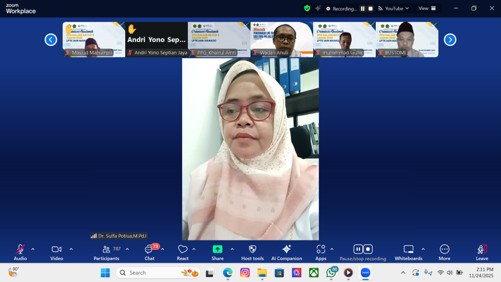 Lembaga Pendidikan Tenaga Kependidikan (LPTK) IAIN Manado menyelenggarakan Orientasi Akademik Program Pendidikan Profesi Guru (PPG) dalam Jabatan Batch 4 Tahun 2025 pada Senin, 24 November 2025, melalui Zoom Meeting. Kegiatan ini menandai dimulainya rangkaian perkuliahan PPG yang akan berlangsung selama tiga bulan ke depan.