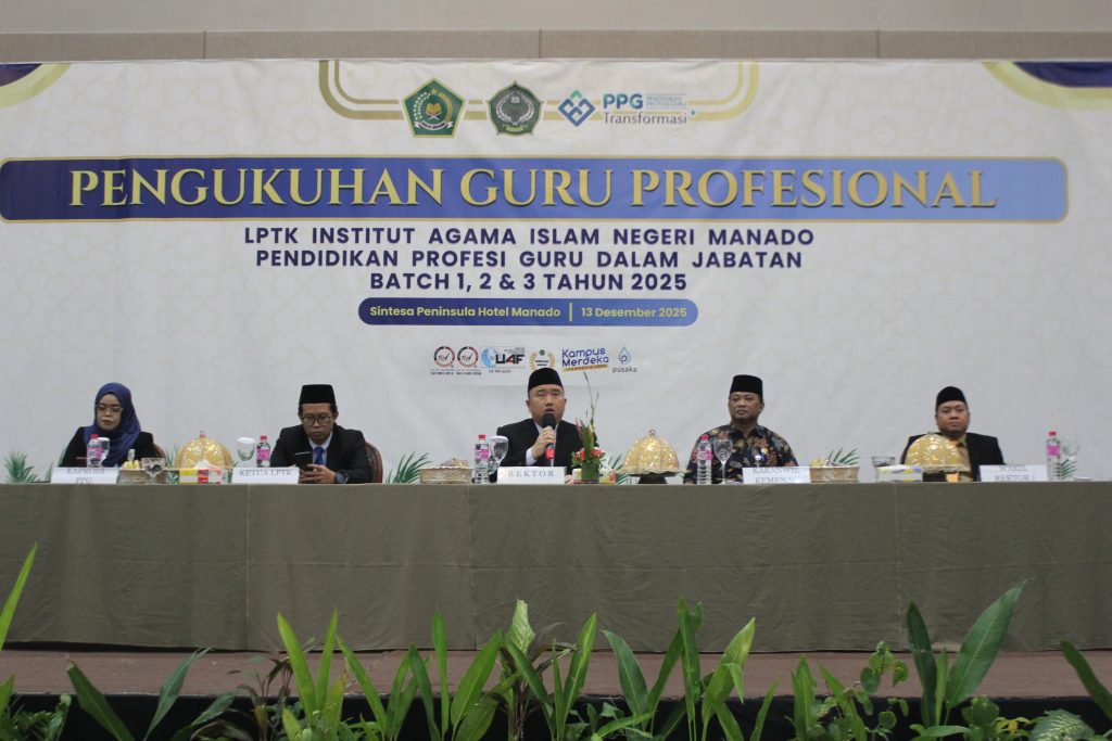 Lembaga Pendidikan Tenaga Kependidikan (LPTK) IAIN Manado menggelar Pengukuhan Guru Profesional Program Pendidikan Profesi Guru (PPG) Dalam Jabatan (Daljab) Batch 1, 2, dan 3 Tahun 2025 secara hybrid pada Sabtu, 13 Desember 2025. Kegiatan ini dipusatkan di Sintesa Peninsula Hotel Manado dan diikuti oleh para peserta baik secara luring maupun daring.