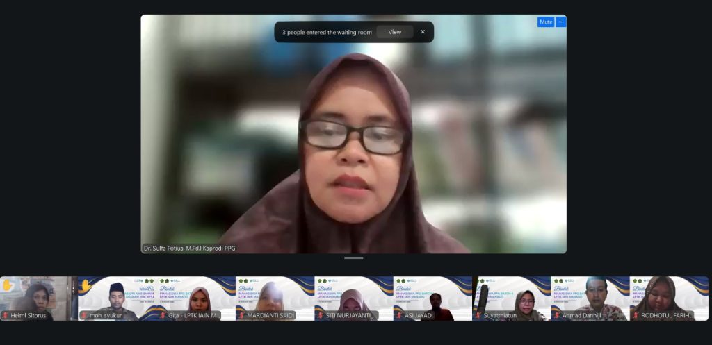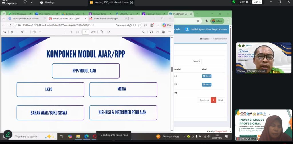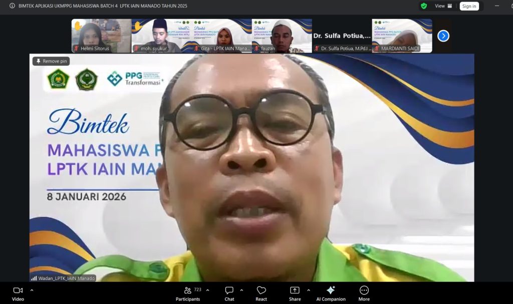 Lembaga Pendidikan Tenaga Kependidikan (LPTK) IAIN Manado menggelar Bimbingan Teknis (Bimtek) Uji Kompetensi Mahasiswa Pendidikan Profesi Guru (UKMPPG) yang meliputi Uji Pengetahuan (UP) dan Uji Kinerja (UKIN), Kamis (08/01/2026). Kegiatan ini dilaksanakan secara daring melalui Zoom Meeting dan diikuti oleh mahasiswa PPG Dalam Jabatan (Daljab) Batch 4 Tahun 2025.